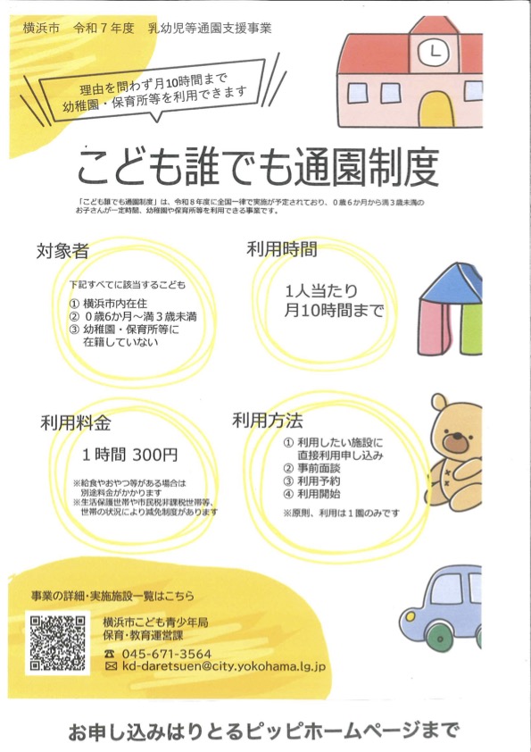 「乳幼児等通園支援事業」の申し込み受付開始しました。 (こども誰でも通園試行的事業は、今年度から乳幼児等通園支援事業となりました) 申し込み期間 5月12日(月)から5月18日(日) ふだん、幼稚園・保育所などに通っていないお子さんが対象です。 保護者... -