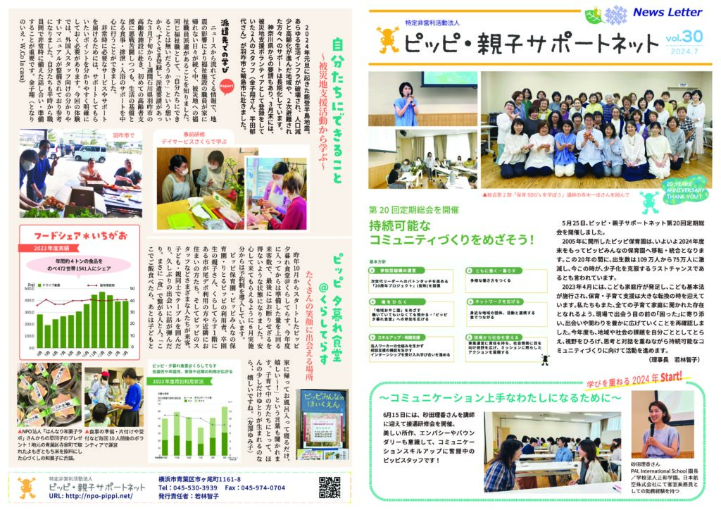 ちょっと時間が経ってしまいましたが、5月25日に開催したピッピ・親子 ネットの第20回総会開催のご報告や、「子どもも大人も主体性を発揮しよう!」をテーマに開催した第2部の研修会を受けた座談会など、ピッピの今とこれからをお伝えします。 能登半島地... -
