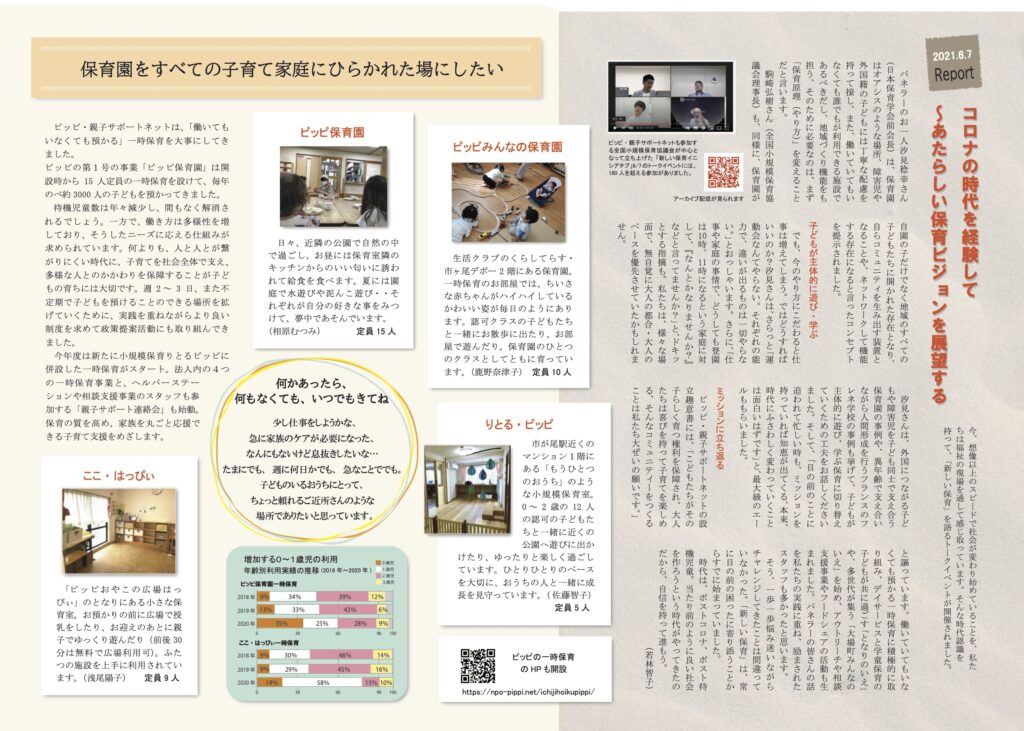 ピッピ親子サポートネットで行った「コロナ禍における保育園利用自粛要請時の家庭状況調査」より、パンデミック下のケア責任の配分をめぐる調査と基礎分析を行った研究論文「コロナ禍で子育ての社会化を考えるー横浜市保育所利用世帯の実態分析から」が横... -
