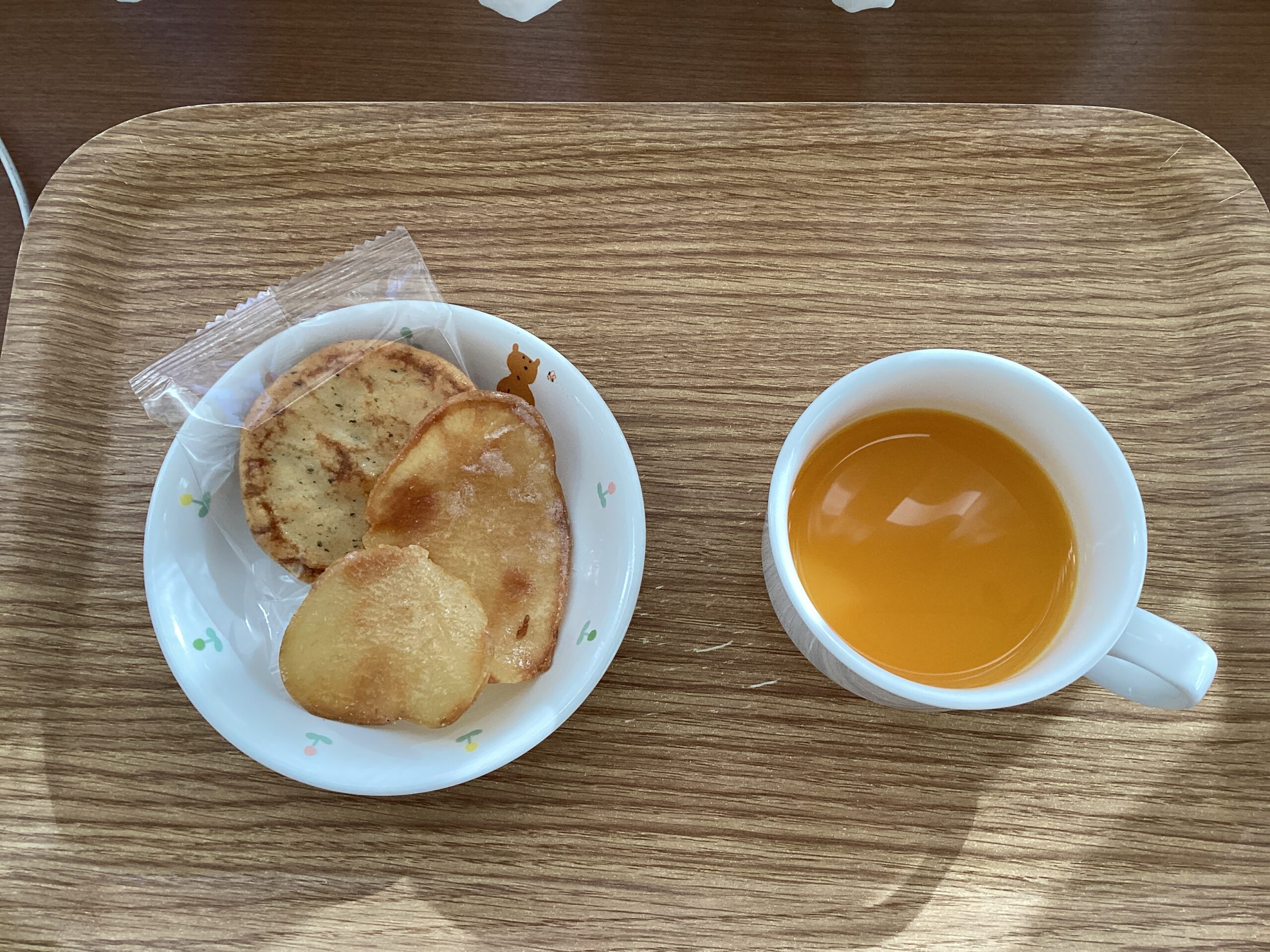 おやつは みかんジュース しょうゆせんべい さつまいもチップス