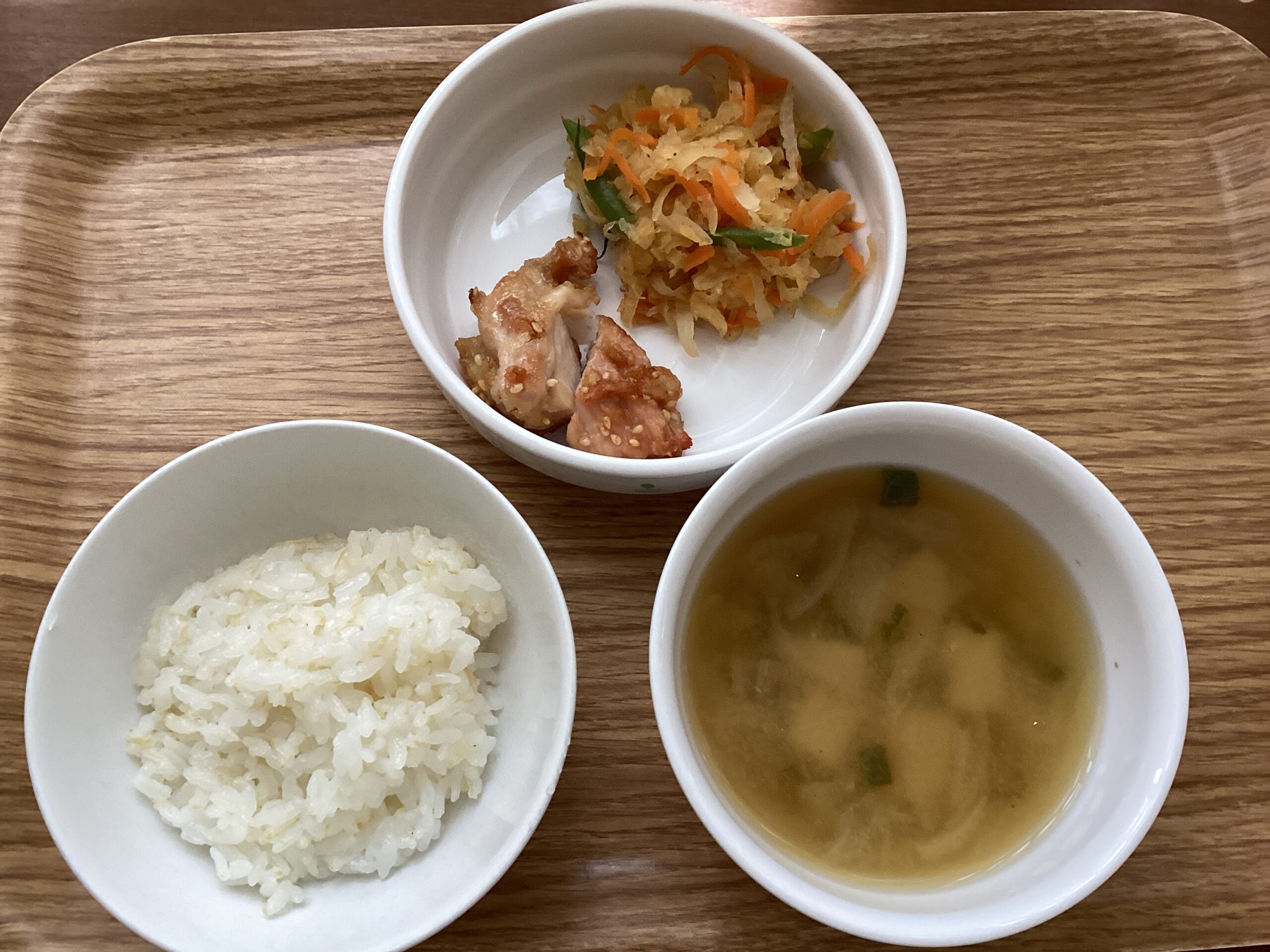 ご飯 かぼちゃのみそ汁 鶏の唐揚げ 納豆小松菜和え