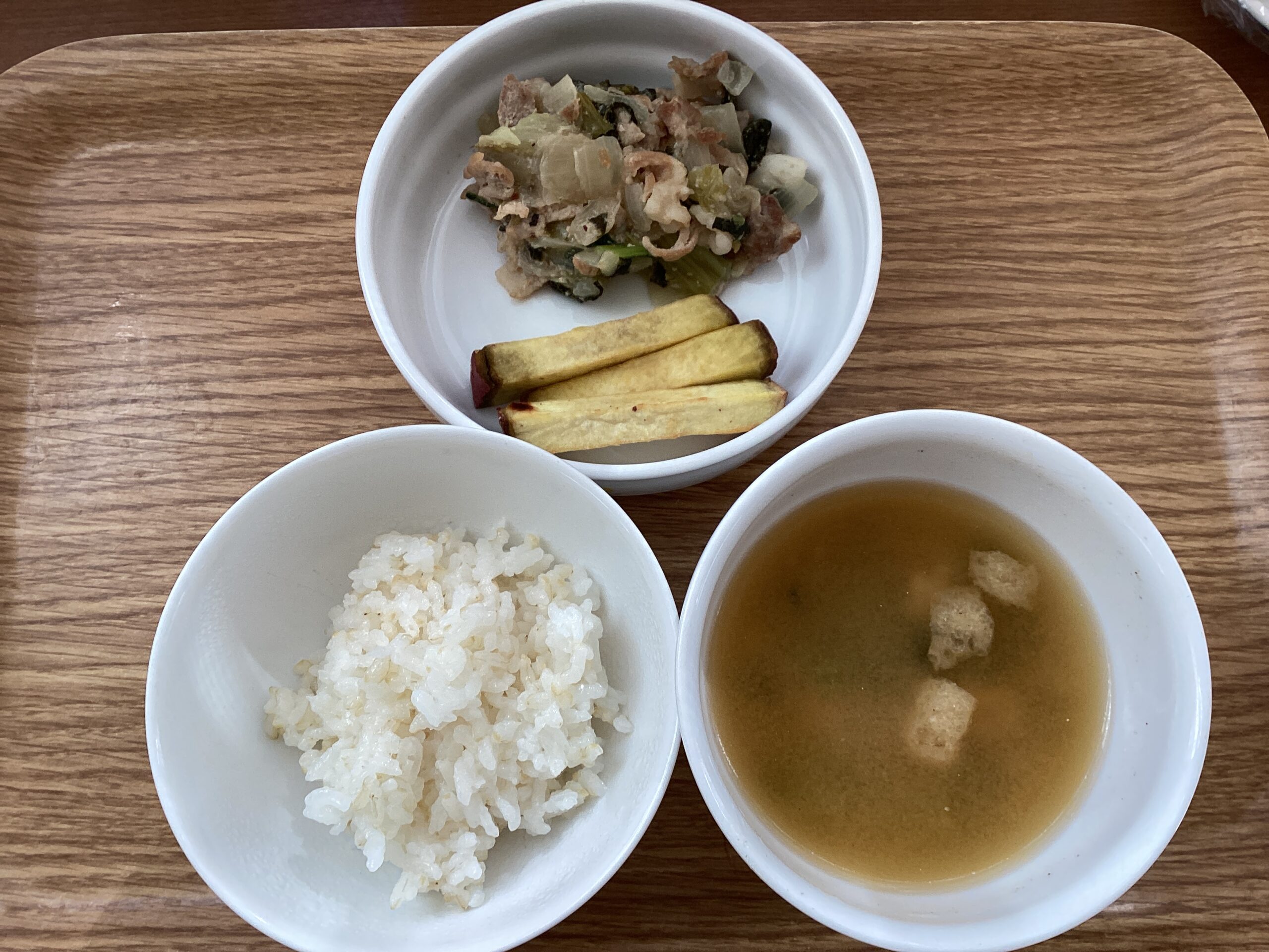 ご飯 小松菜のみそ汁 豚肉しょうが焼き さつまいも素揚げ