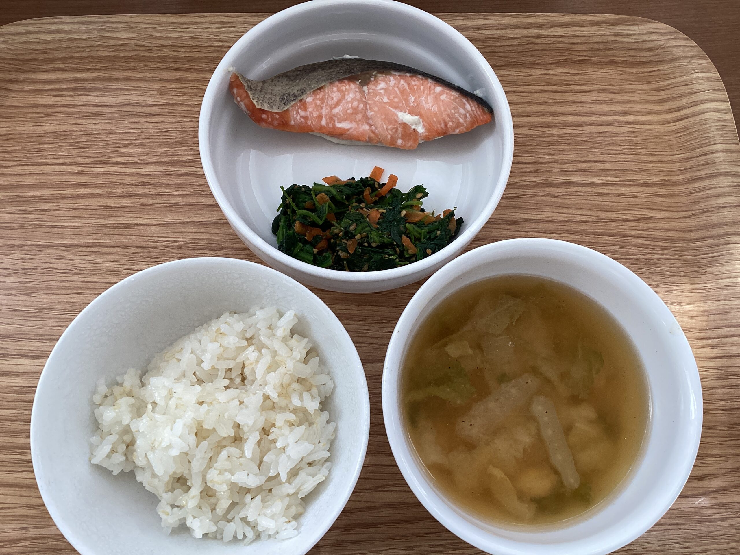 ご飯 白菜のみそ汁 鮭の塩焼き ほうれん草の胡麻和え
