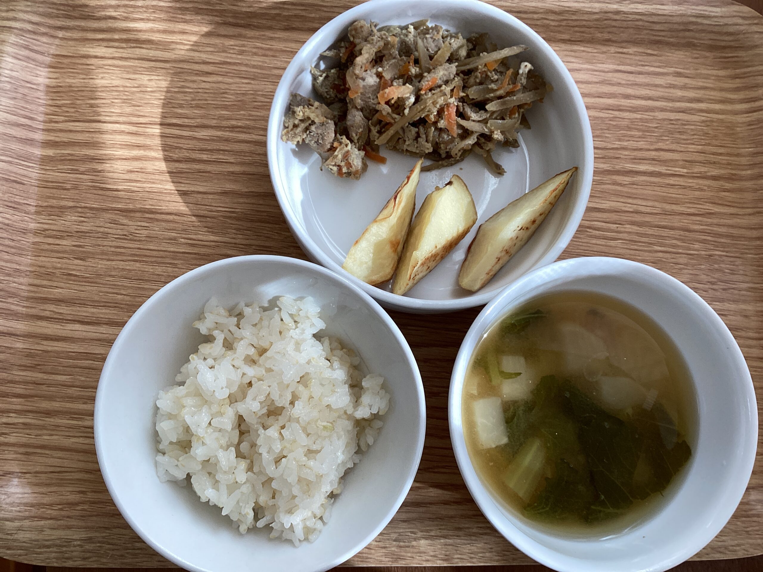 ご飯 大根のみそ汁 生揚げと豚肉の五目煮 さつまいも素揚げ