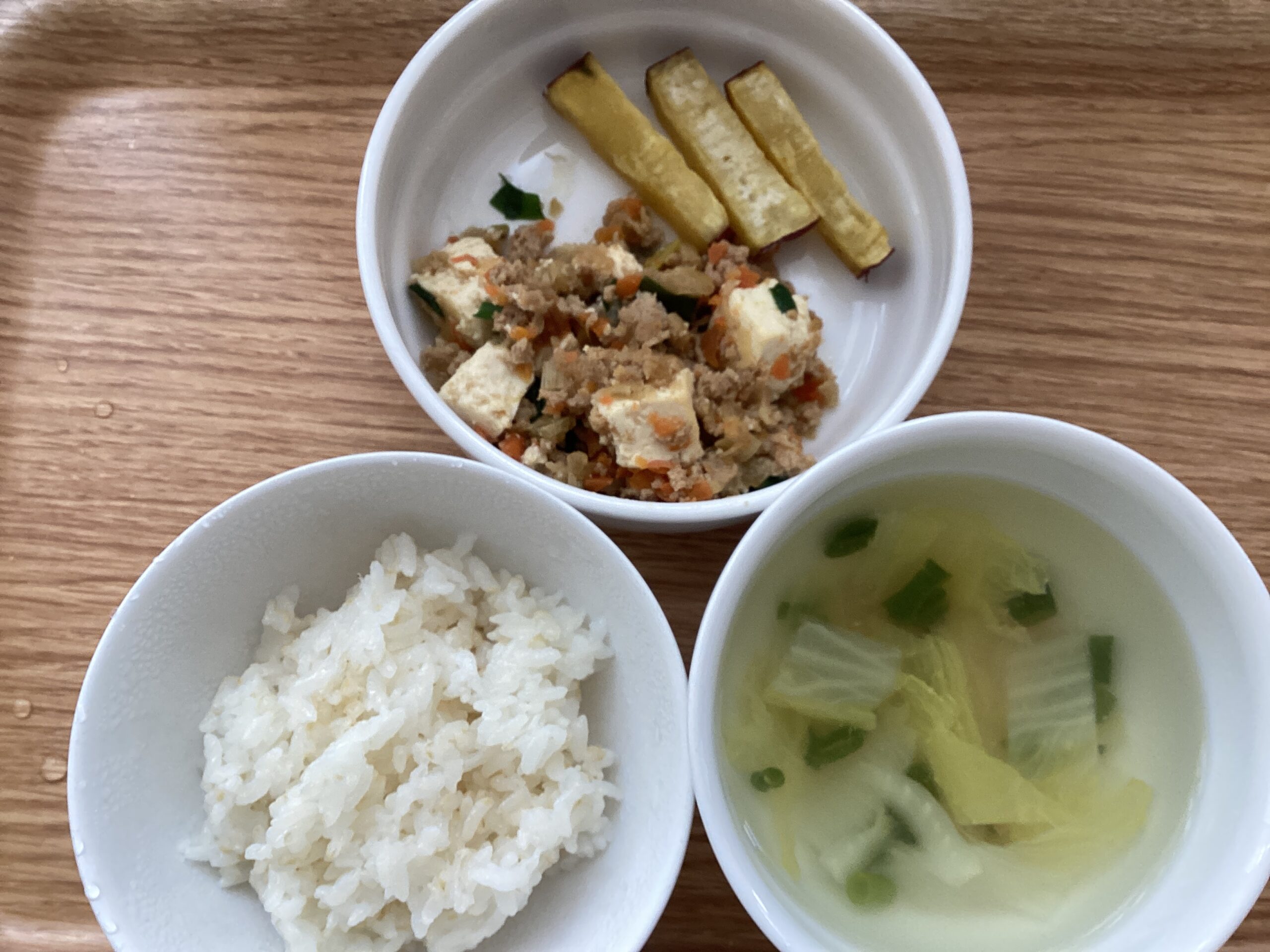 ご飯 白菜ツナスープ 麻婆豆腐 さつまいも素揚げ