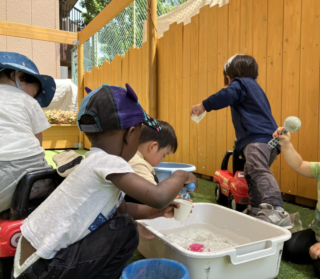 5月なのに 暑い! 今年度初めて お水で遊びました。 リニューアルしたお庭で お水遊びに夢中でした!! -
