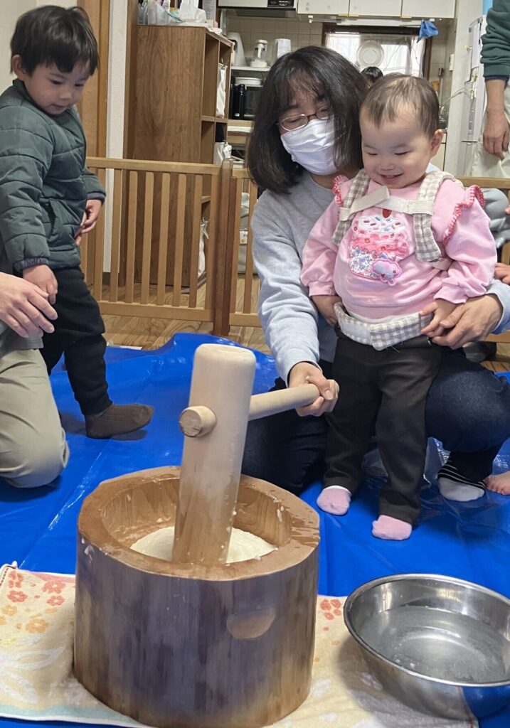 炊き立てのもち米をちょっとずつお味見した後は 「よいしょ!よいしょ!」と始まった! ついたおもちは しばらく干して...。 さて 何になる? -