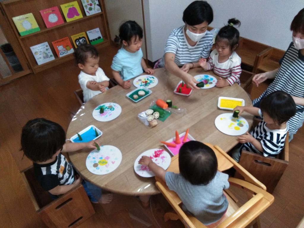 いよいよ夏まつりウィークが始まりました! 今日は「野菜スタンプうちわ」です。 うちわの裏に、 にんじん・オクラ・きゅうり・レンコンのスタンプをしました。 勢いよくスタンプをする子、そーっと押して形が出てくるのを楽しむ子。 小さい子も、野菜の色...