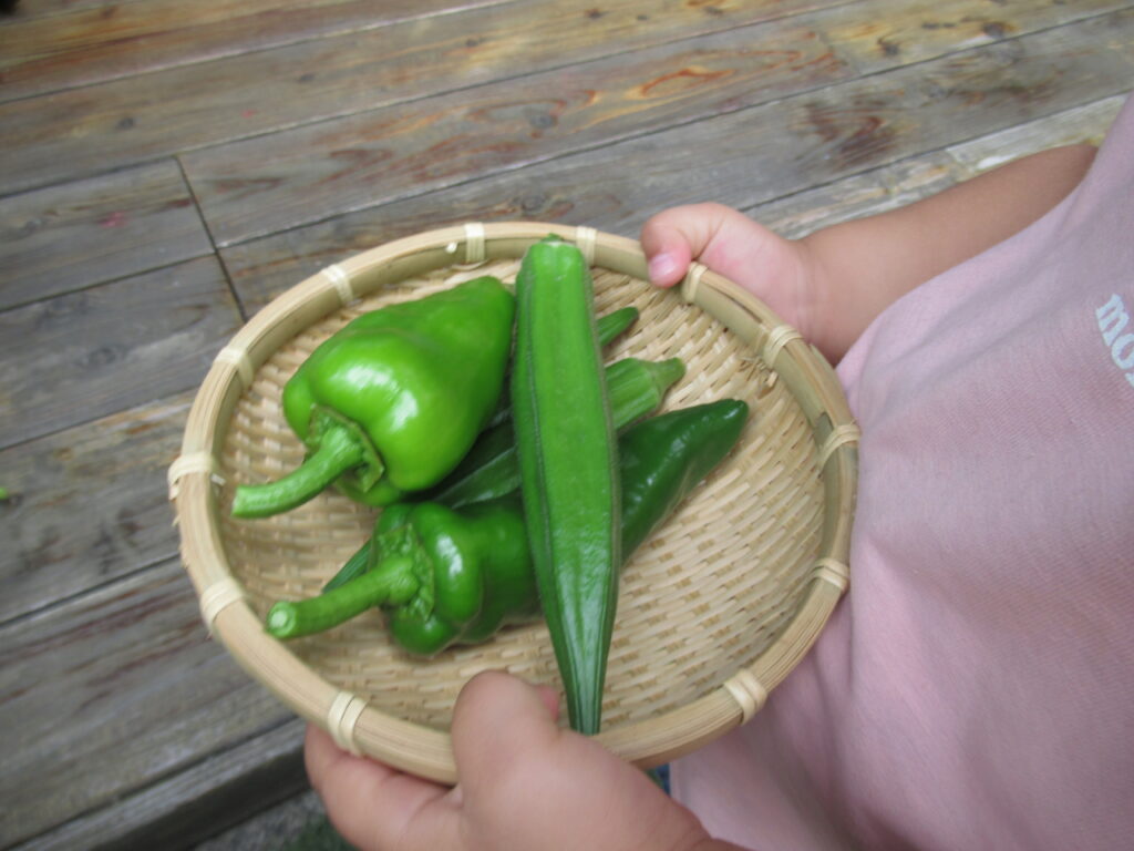 今日は庭になっているパプリカとオクラを収穫 雨降りの日はお部屋で みんな真剣ね。 新聞ビリビリ そしてパック詰め -