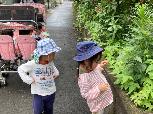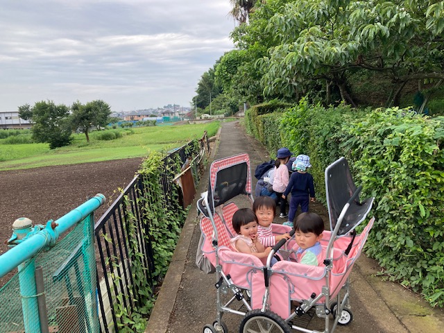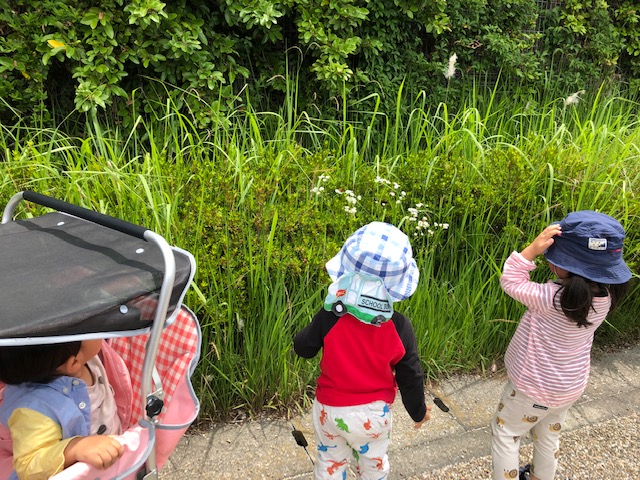 風が吹くと いい気持ち カワセミや かもの親子(もう赤ちゃんでは なくなっていた!)を見ながら の 帰り道 もう疲れちゃって 歩くのいやだよ~ と 座ってみたりして 坂道をのぼったら 保育園だよ! おいしいお昼ごはんを食べようね