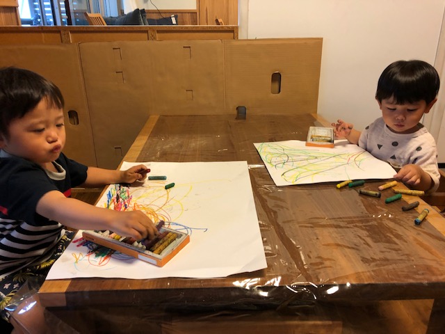 雨降りの木曜日 おえかきが始まった 画用紙だけには おさまらないよ! はみだしたって どんどん 描くよ きれいにならべた クレヨンを 今度は 箱に もどします お次は 箱を解体して ふたに クレヨンを・・・・ 自由!! -