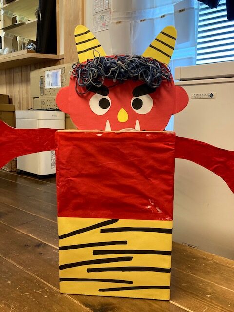 シールを貼って、つのを付けて、自分で作った豆入れを手に いざ! 「おには~ そと~!」 やさしい子どもたち 豆を投げずに おにさんのおなかのなかへ そっと いれる お役目 ご苦労 -