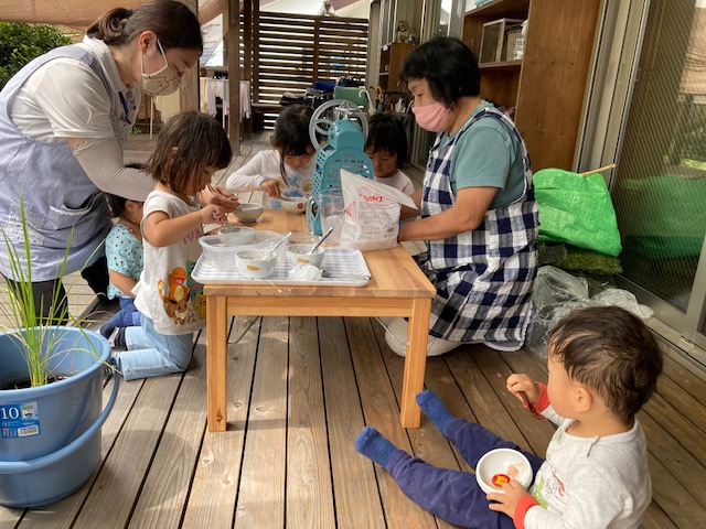 昨日は3歳になった子のお誕生会でした。 おたんじょうびおめでとう!! とみんなでお祝いをした後はいつものように元気に公園へ。 嬉しい気持ちが残っていた子どもたち‥ 焼き鳥や ケーキを作って お祝いの続きを。 -