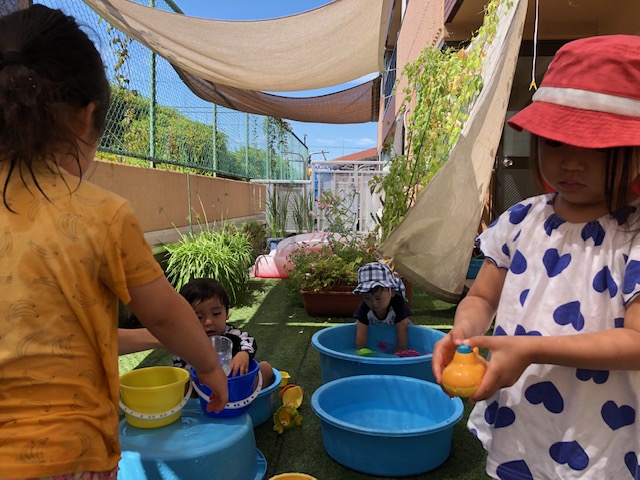 暦の上ではもう秋ということですが 残暑厳しい毎日ですね。 とはいえ、やはり子どもたちは元気です!今日も全力で遊んでいます。 まずは、かぶちゃん&かぶたにご挨拶を‥‥ そして水遊び! 水遊び用のおもちゃを柱にぺたぺた‥‥。 子どもの発想は豊かでユ... -