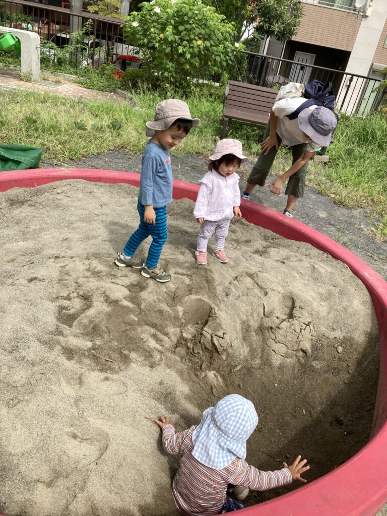 ちょっと涼しかったので「ぶた・かめ公園」に行ってきました。 久しぶりのお散歩に子どもも大人も嬉しくてニコニコです。 砂場に大きな穴が!おそるおそる穴の中に・・ お砂場遊びに夢中 公園を探検!「バッタがいたよ」と捕まえてお友だちに見せ... -