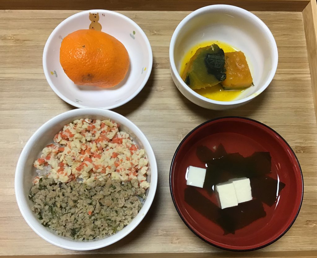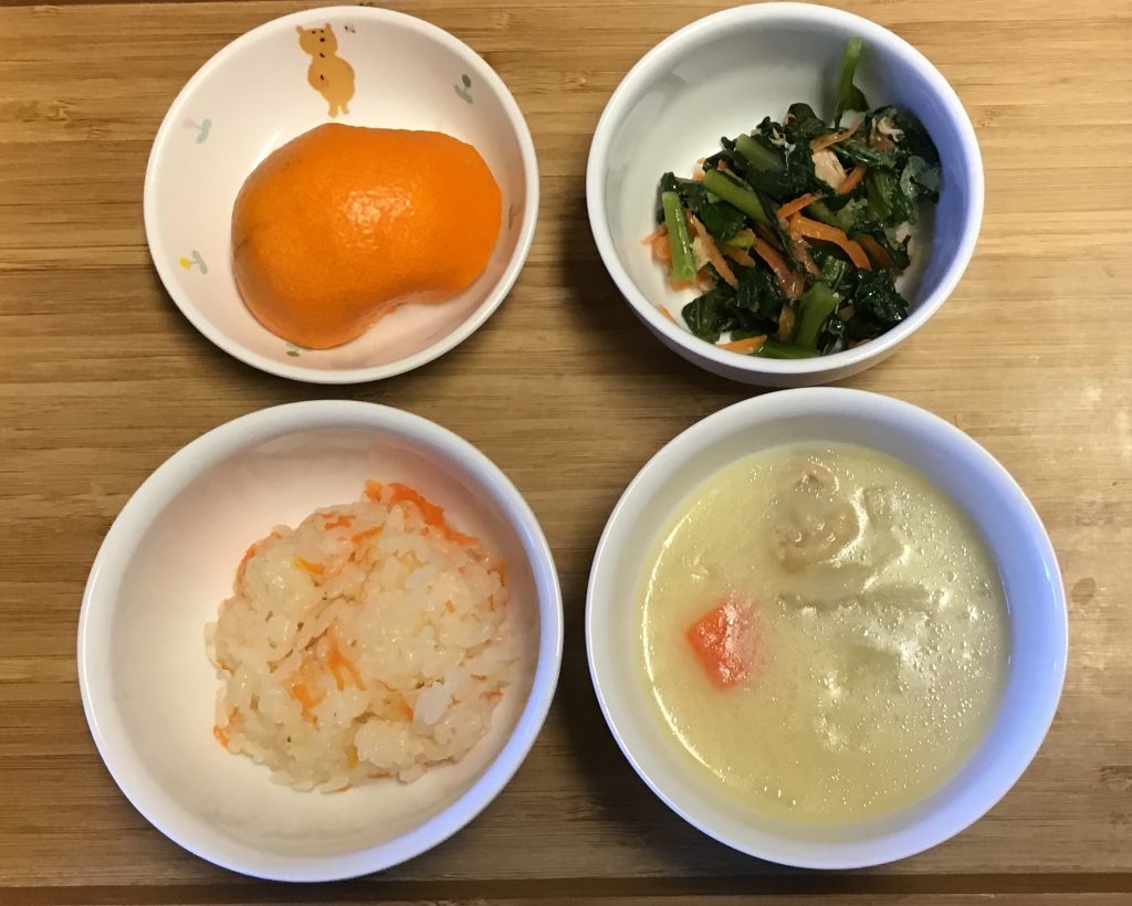キャロットライス、クリームシチュー、ツナ小松菜サラダ、みかん。 おやつはヨーグルトフルーツ。