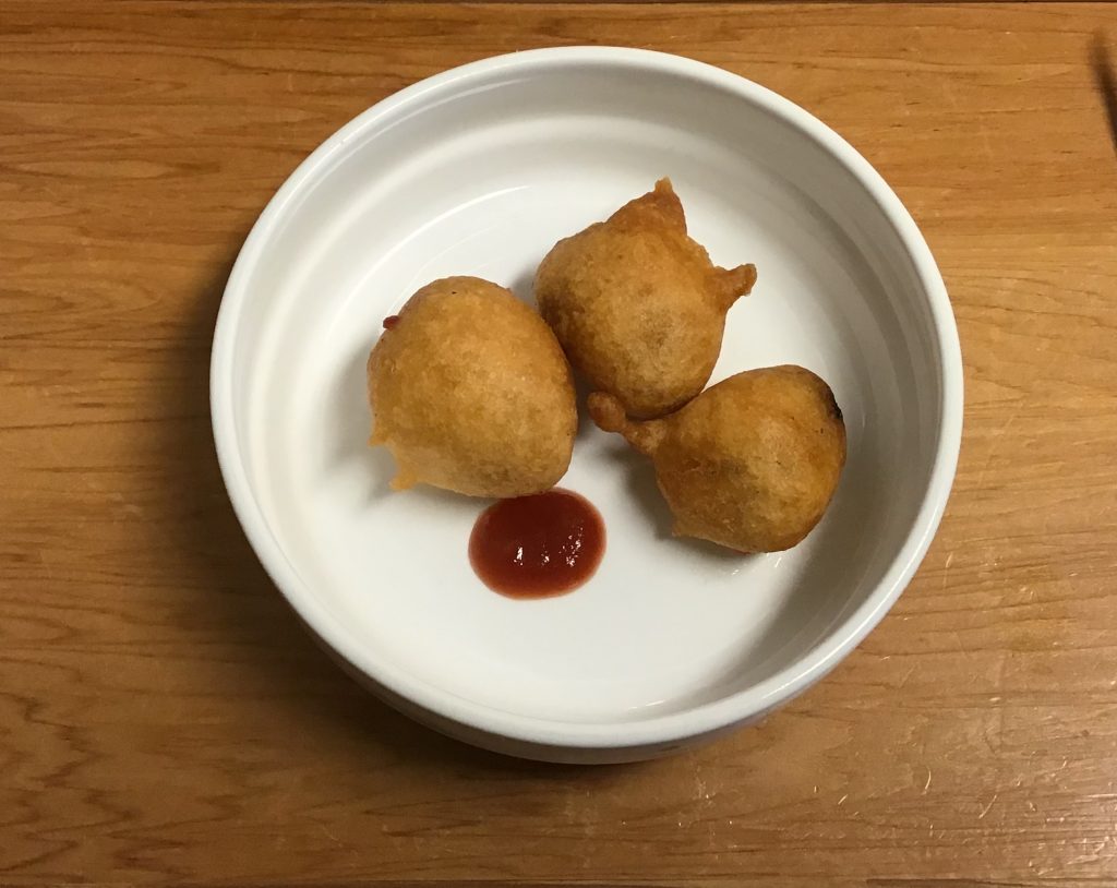 ごはん、大根のすまし汁、松風焼き、ひじき煮。 おやつはきな粉揚げパン。
