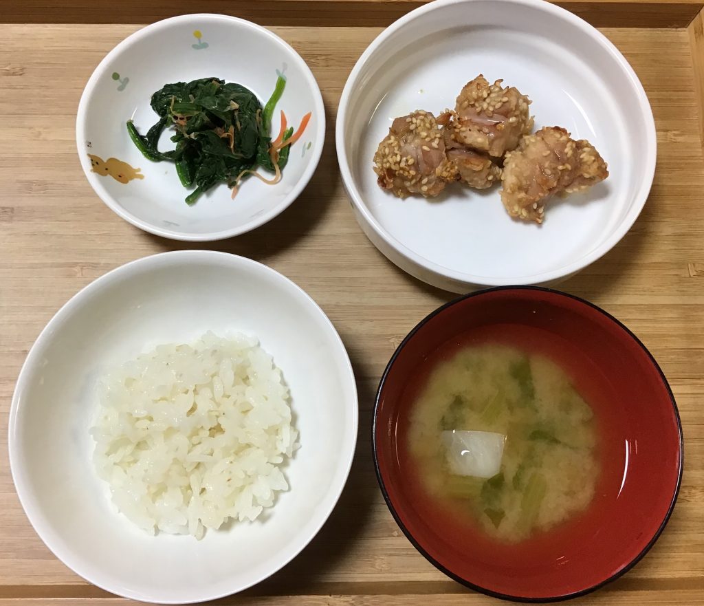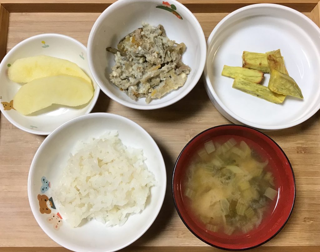 ごはん、ニラごまスープ、生揚げの中華炒め、ブロッコリーの中華漬け、バナナ。 おやつは、人気のきな粉揚げパン。