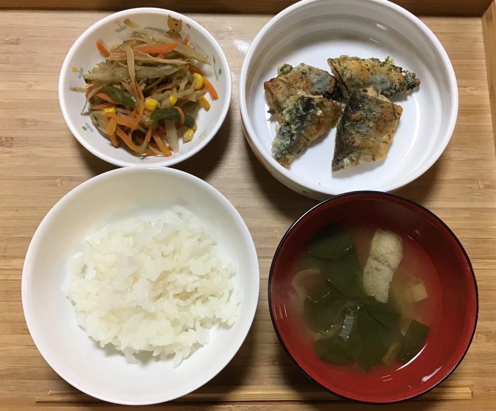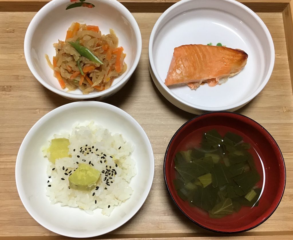 さつま芋ごはん、小松菜のすまし汁、鮭のみそ焼、切干大根煮。 おやつは、揚げパン。 -