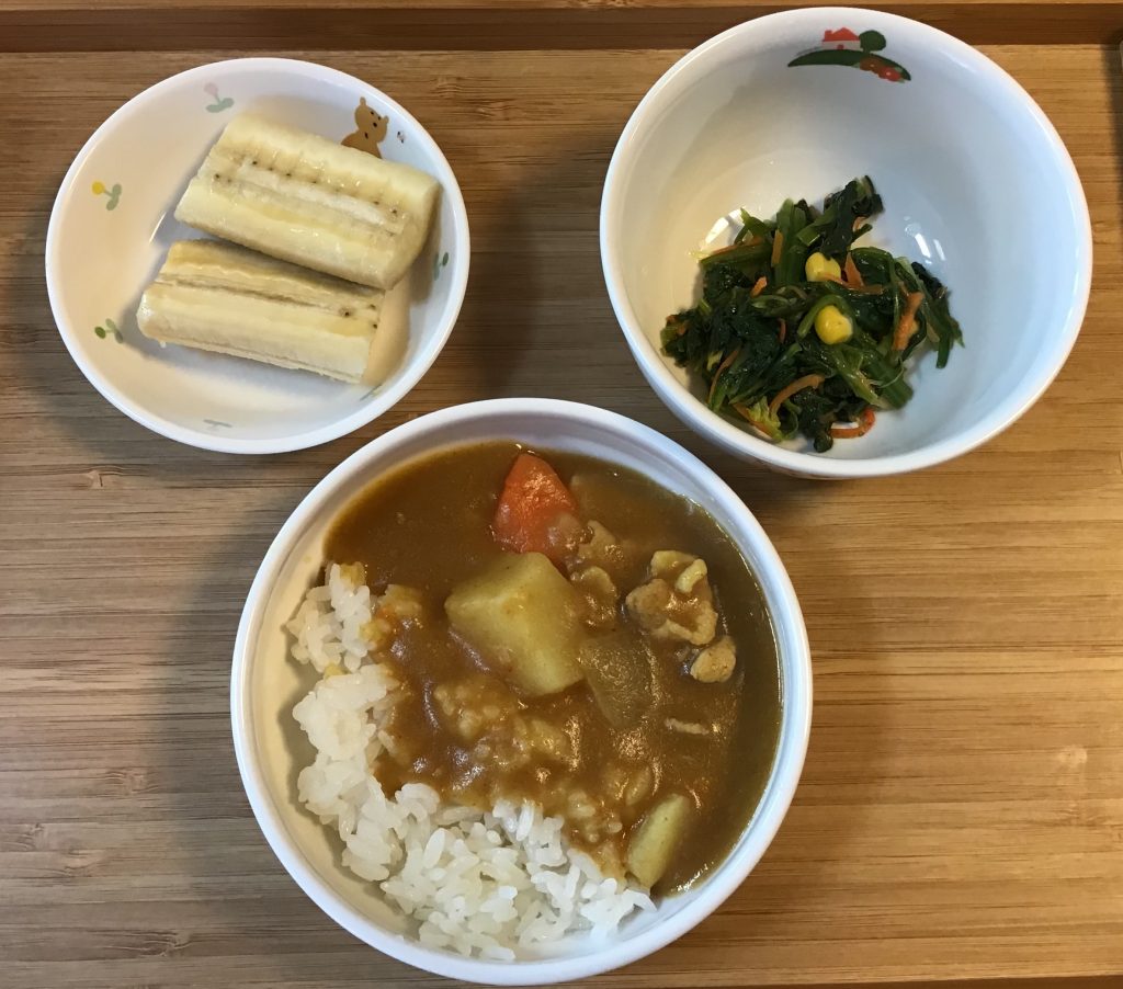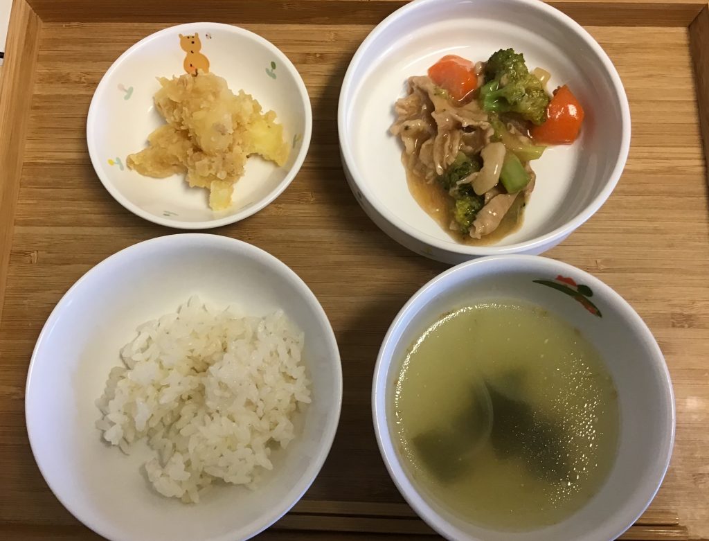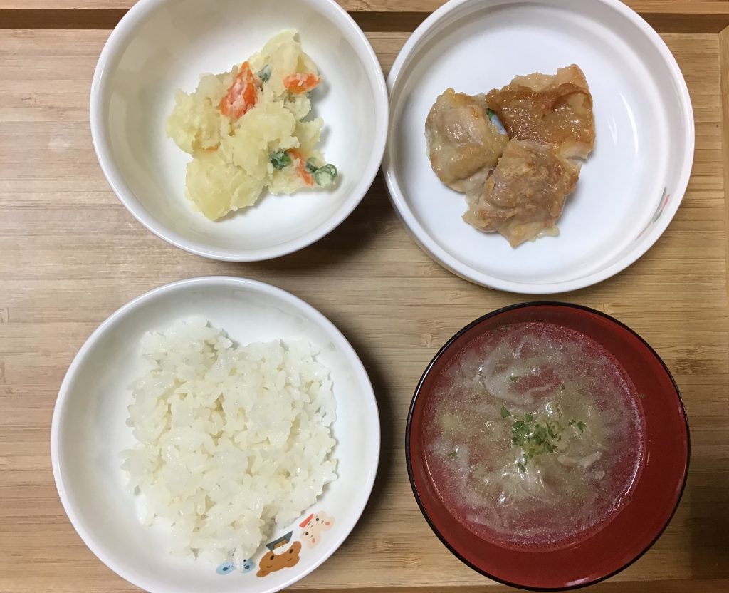 ごはん、キャベツスープ、鶏のから揚げ、ポテトサラダ。 おやつは、ジャムサンドと牛乳。 -