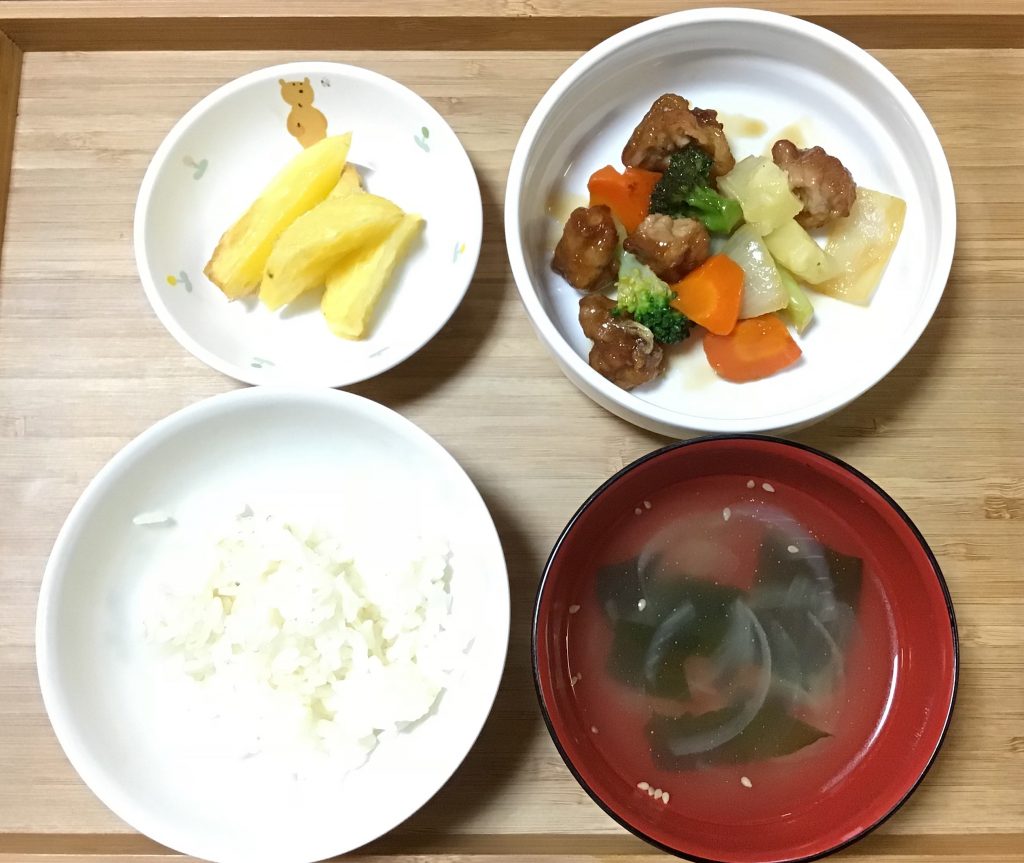 ごはん、玉ねぎとワカメのスープ、酢豚、じゃがいものおかか和え。 おやつは、お好み焼き。 -