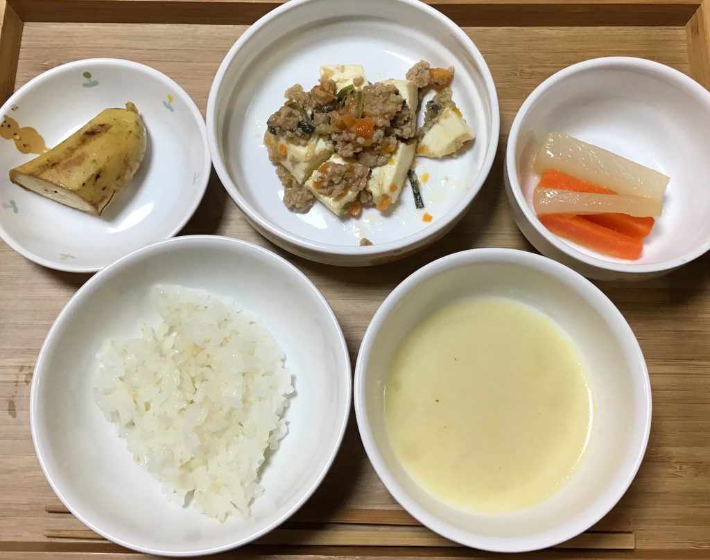 ごはん、中華コーンスープ、麻婆豆腐、大根と人参の中華漬け。 おやつは、見た目やや和風なスイートポテト。 -