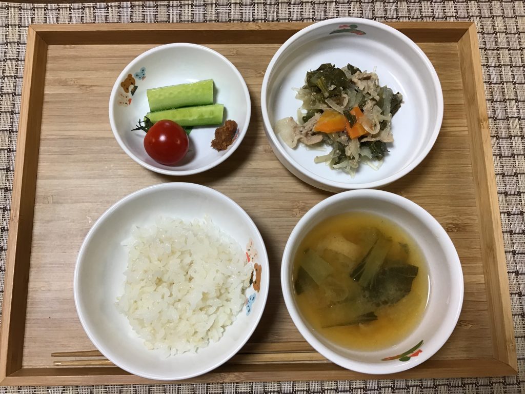 ごはん、みそ汁、豚肉すき焼き煮、?? おやつはホットケーキでした。写真撮り忘れました。 -