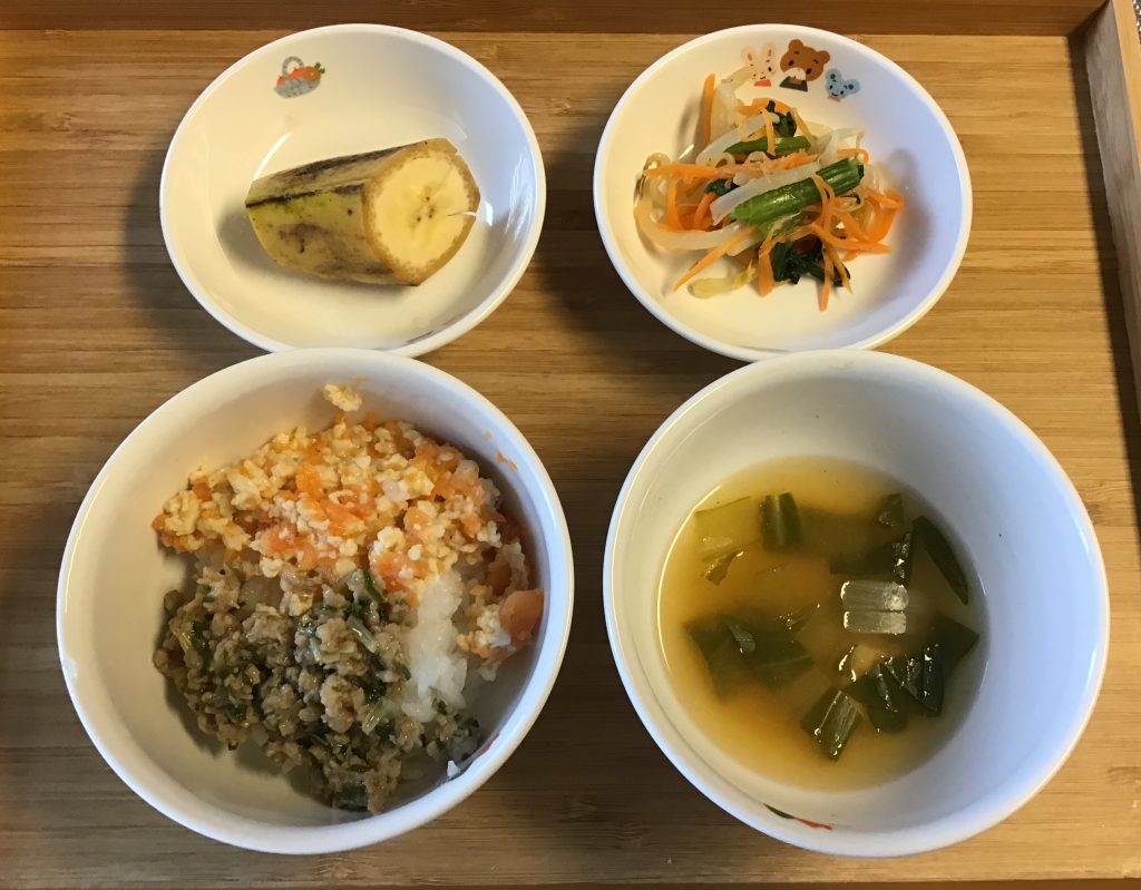 そぼろ炒り卵ごはん、青梗菜のみそ汁、ミックスナムル、バナナ。 おやつは、きな粉マカロニ。 -