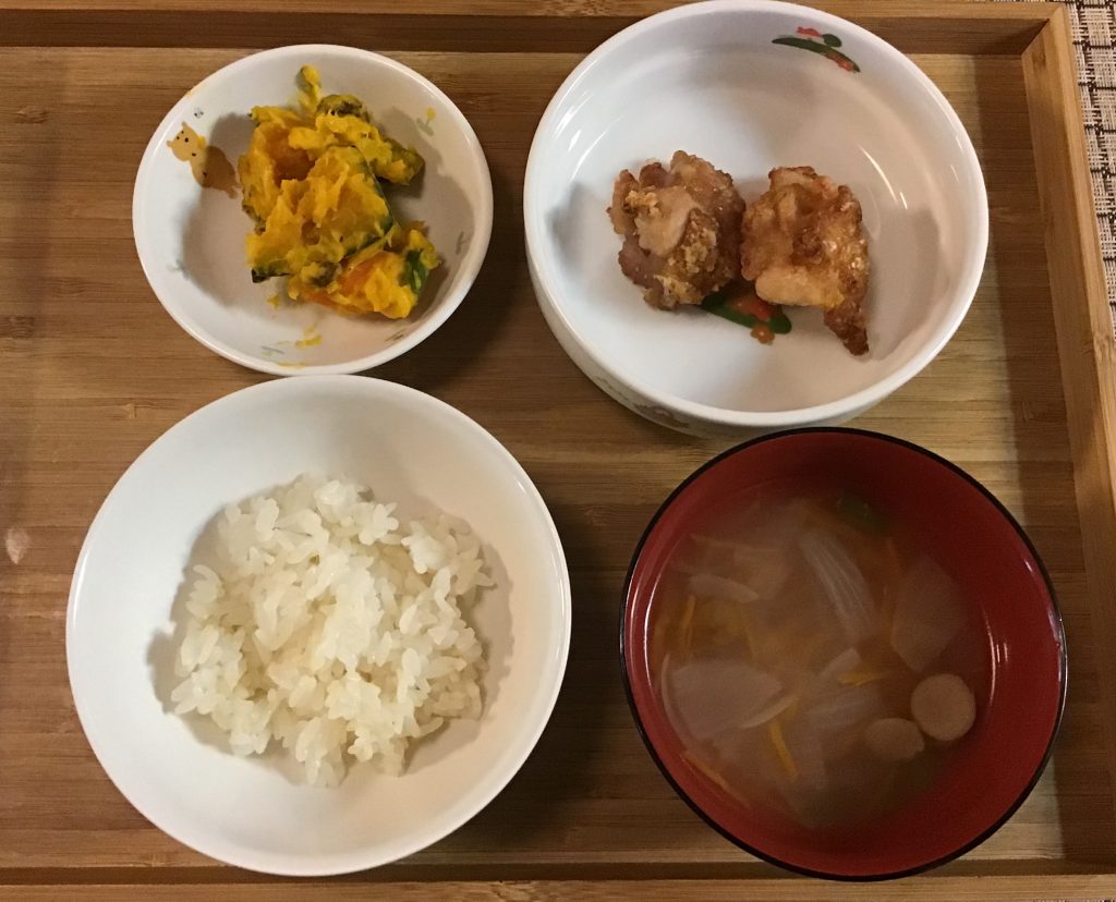 ごはん、春雨スープ、鶏のから揚げ、かぼちゃサラダ。 おやつは、大学芋。 -