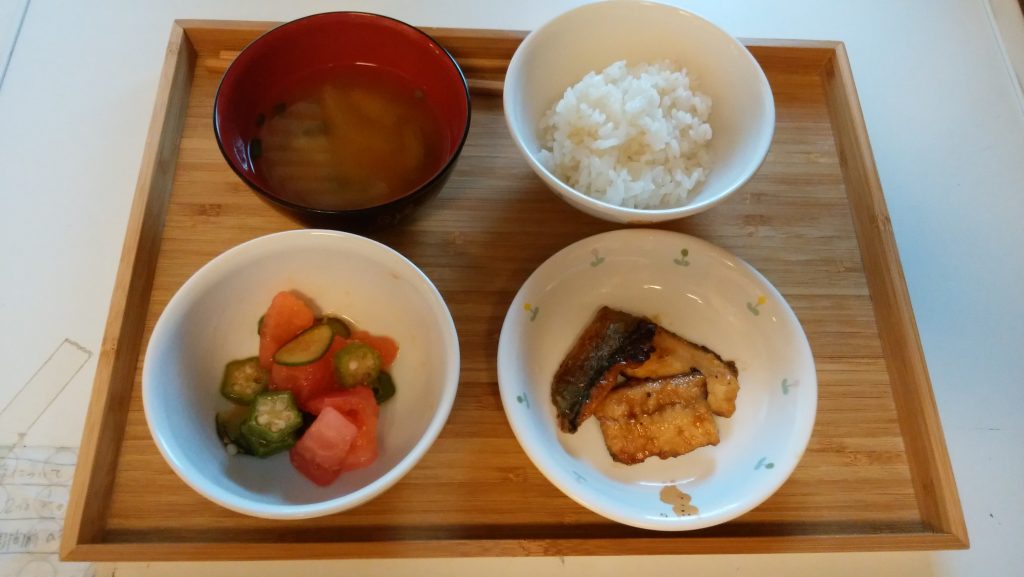 ごはん、ナスのみそ汁、サンマの蒲焼き、トマトとオクラのごま酢和え。 おやつは、ヨーグルトフルーツでした。