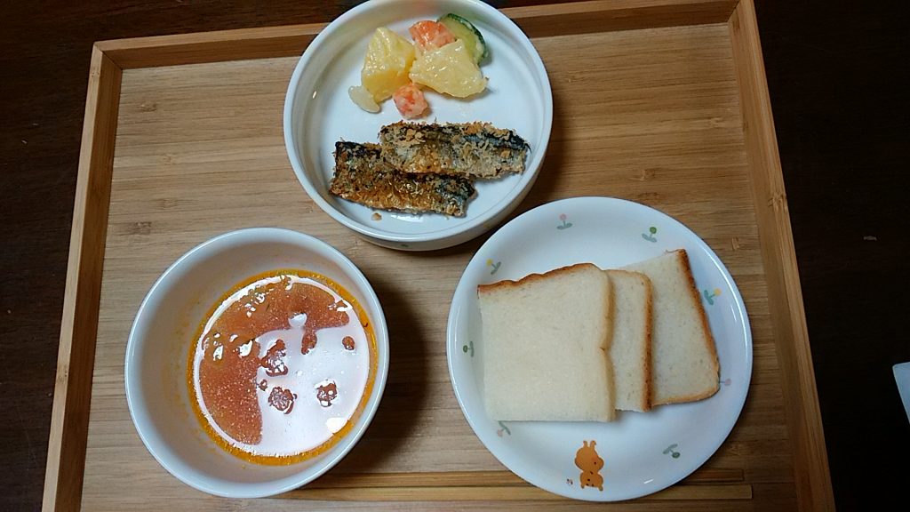 今日の給食は、サンマのパン粉焼き。