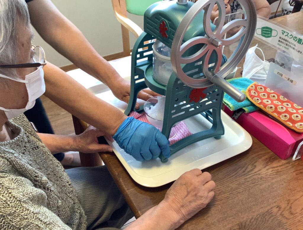 今日のおやつはかき氷❣ 手動カキ氷機で自分で作る、真剣なお顔で頑張っています! ガリガリと削る感触を楽しんでいるのが伝わります。 好きなシロップを選んでね。皆さん、いちごが人気。 頭がキーンと来た人はいるかな。 -