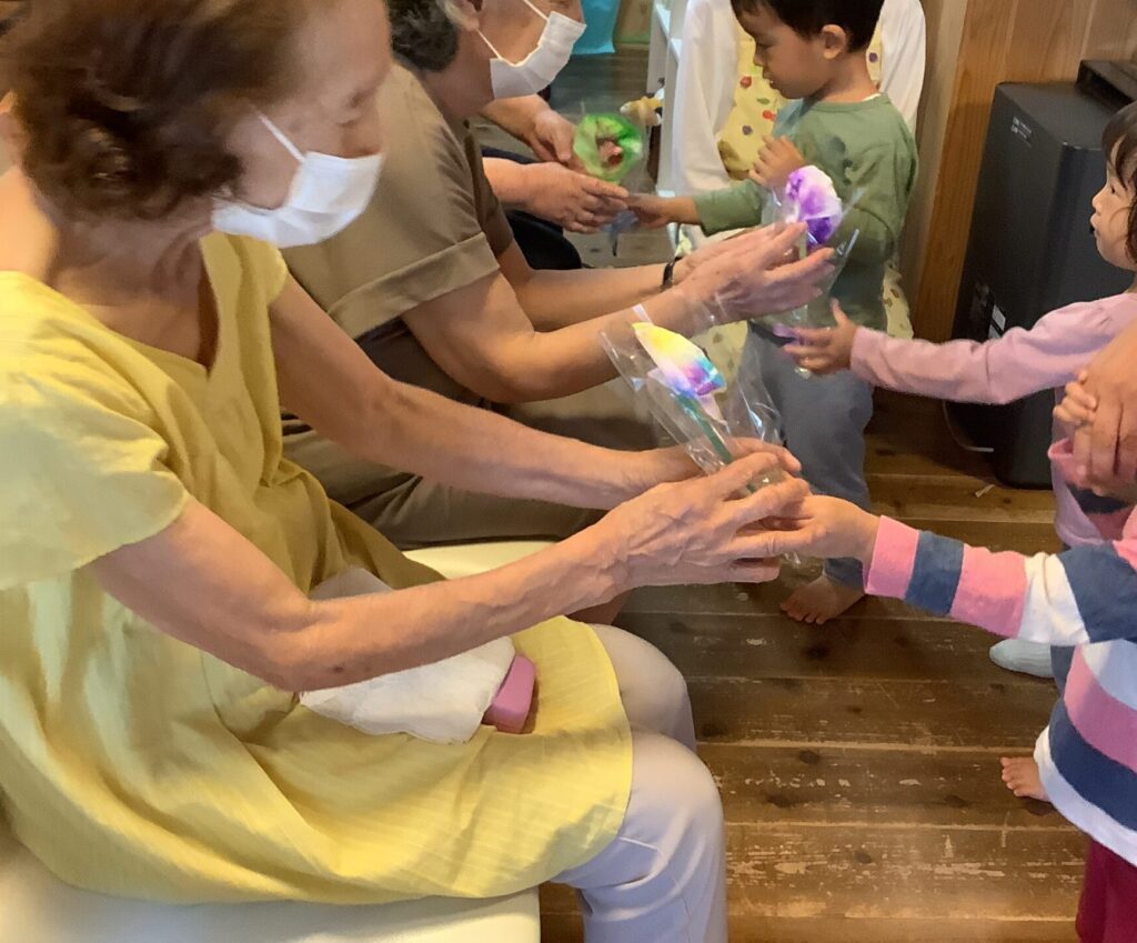 りとるのこどもたちから敬老の日のお祝い❣ 「ダンス」と「にじみ絵のお花」のプレゼントをいただき、 皆さん笑顔いっぱい、うれしそう。 こどもたちから「おばあちゃん」といつも声がかかります。 -