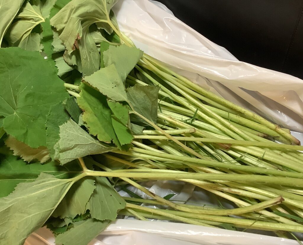 フキをいただき、皆さんで皮むき 皆さん、手早くお手のもの 「葉っぱも食べれるのよ」 「茹でて炒めてね」 「葉っぱは食べたことはないわ」 「手が黒くなるけど、台所の仕事をしていればすぐとれるわよ」 「お昼に間に合うかなあ・・」 会話も弾み、早く食...
