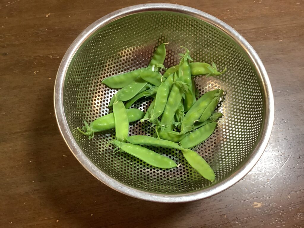 収穫は楽しいね! 苗から育てた「きぬさや」は思いがいっぱいつまっている。 -
