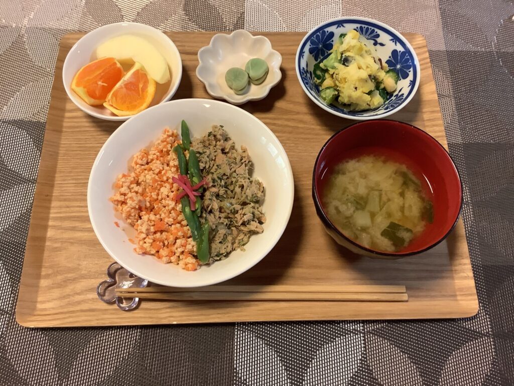 皆さん、お昼ご飯は楽しみのひとつです。 メニューも気になります。 プランターで栽培した「きぬさや」も登場しています。 今回のお楽しみメニューは何かな? -