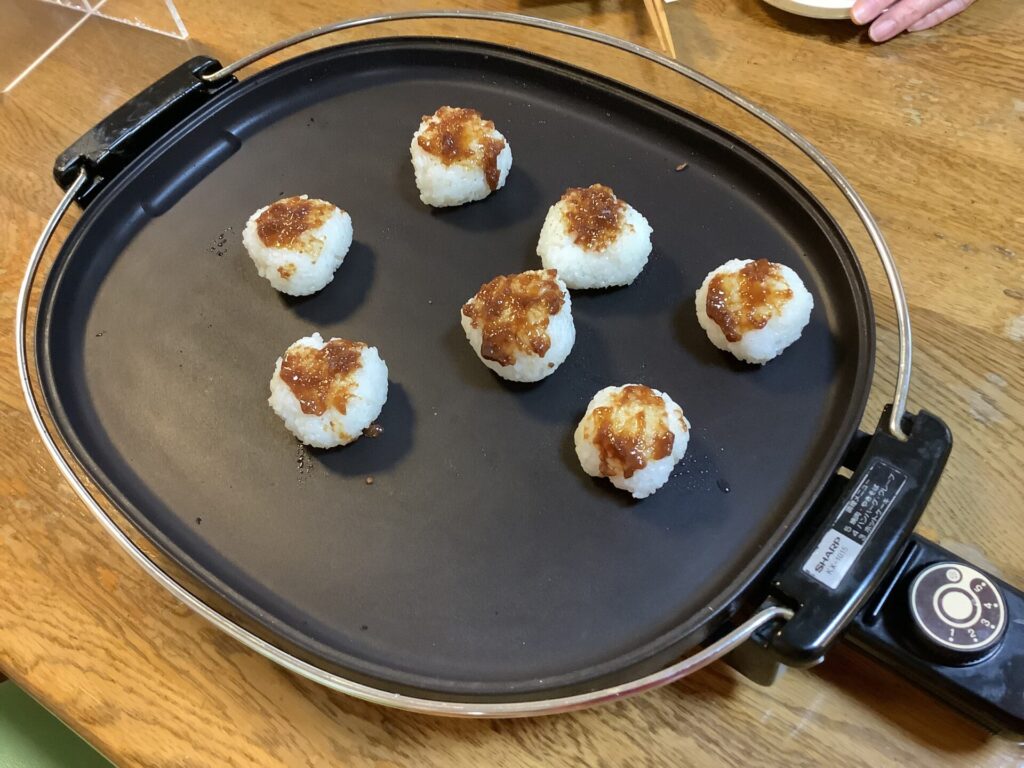 今日のおやつは焼きおにぎり! ホットプレートで両面焼き、香ばしい味噌や醤油の香りが食欲を刺激します。 甘みそとだし醤油で熱々の焼きおにぎりが出来上がり。 早く食べたいね。 -