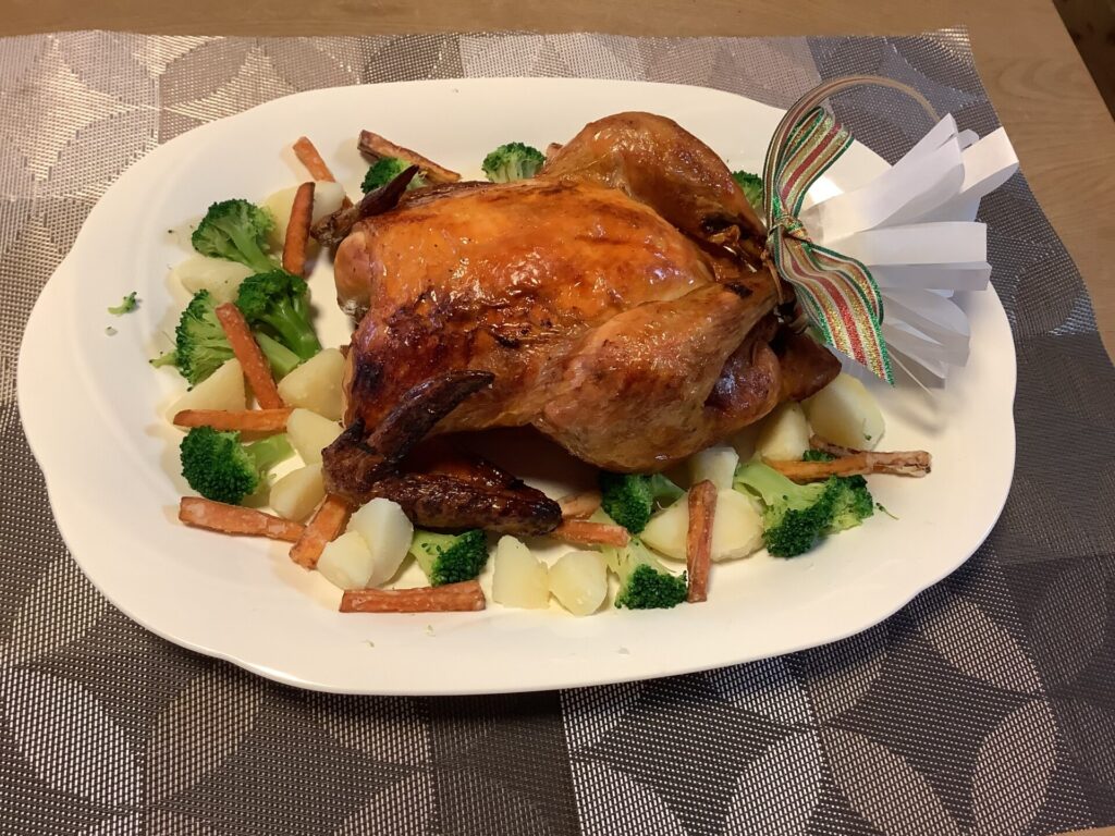 まちの台所で丸鶏のローストチキンが出来上がりました。 お昼はお楽しみランチ❣ -