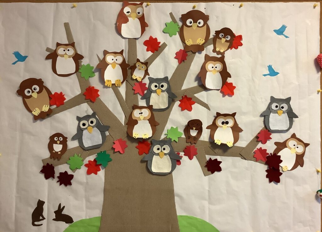 かわいいフクロウが集合、親子や兄弟、みんな家族です。 フクロウのツリーからクリスマスツリーに変身です。 -