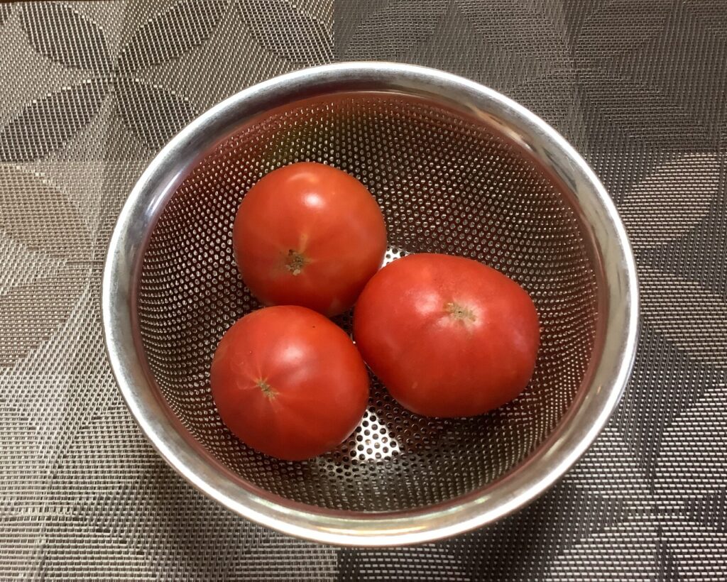 真っ赤な完熟トマト、いつ収穫するの!今でしょ。 今日のお昼に食べたいね。見ているだけで食欲がそそります。 生食が一番ね。早く台所に持っていこう。 -