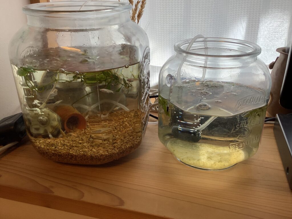 3月19日に生まれたメダカがやってきました。 「赤ちゃんメダカどこにいるのかなあ」「小さくてみえないね」 「あ~いたいた。小さいね」 「本当に小さいね」と会話も弾みます。 小さくても泳ぎは「す~い、す~い」 無事に育ってほしい。 -