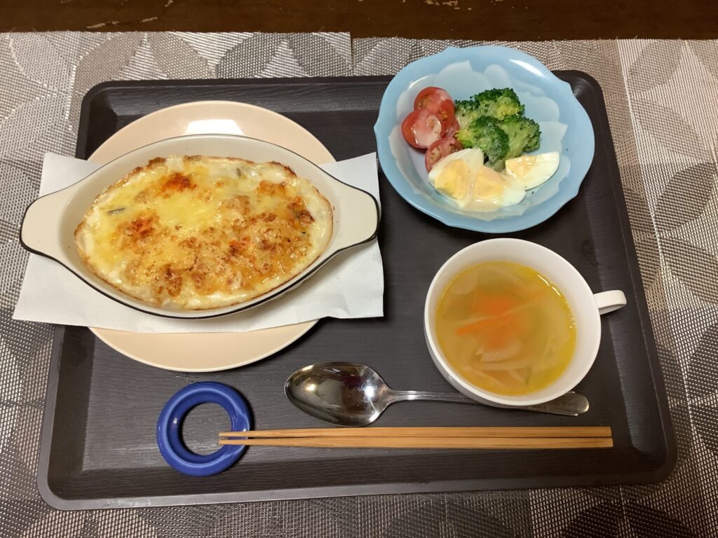 今日のメニューは、シーフードドリア。 アツアツで焼き目が食欲をそそり、 ドリアはお好きのようで皆さま完食でした。 -