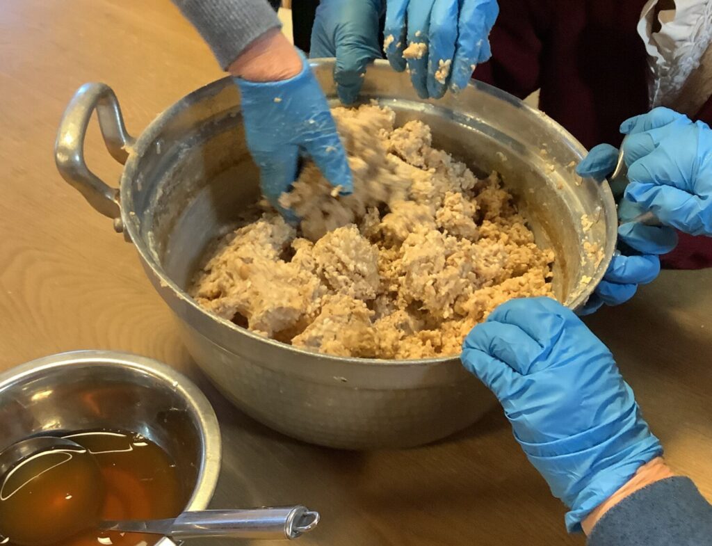 みんなでワイワイ味噌作り❣ 寒仕込みは美味しいお味噌ができあがります。 自分たちの手で仕込めば味は格別です。 深い味わいと豊かなコク。 出来上がりが楽しみですね。お昼ご飯にでてくるかな。 -
