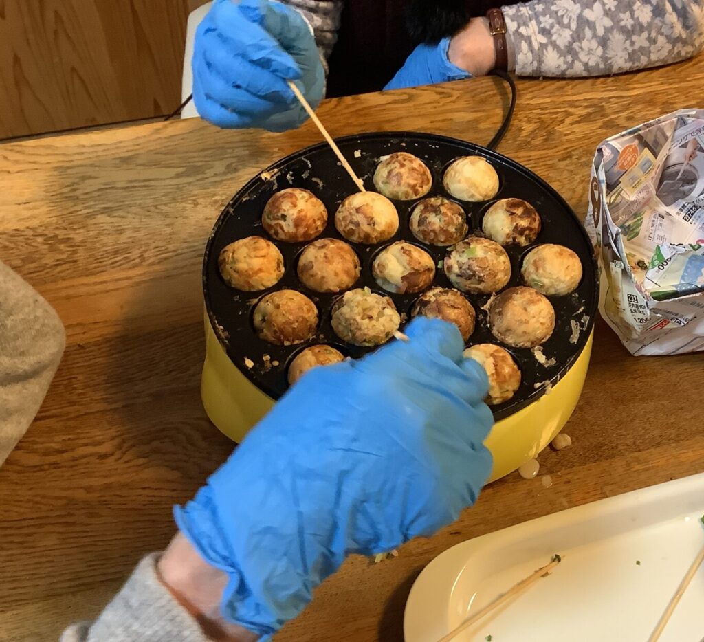 みんなでたこ焼きを焼こう。 くるくる回して外はカリッと中はトロトロふわっと。 美味しくできあがりました。アツアツです。 -