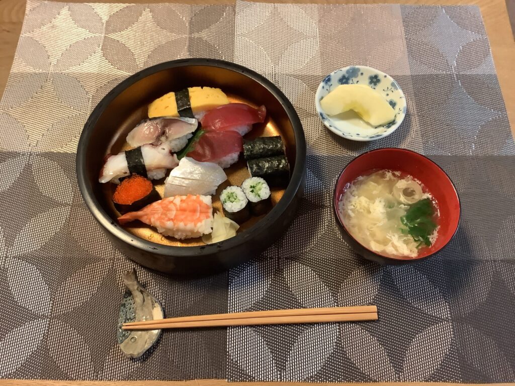 台所がお休みなので、今日は出前の日、 前もって皆さんに「出前は何がいいですか」と希望をとると お寿司が人気ですね。 「おいしかったね」と皆さん、ご満足いただけるお昼でした。 -