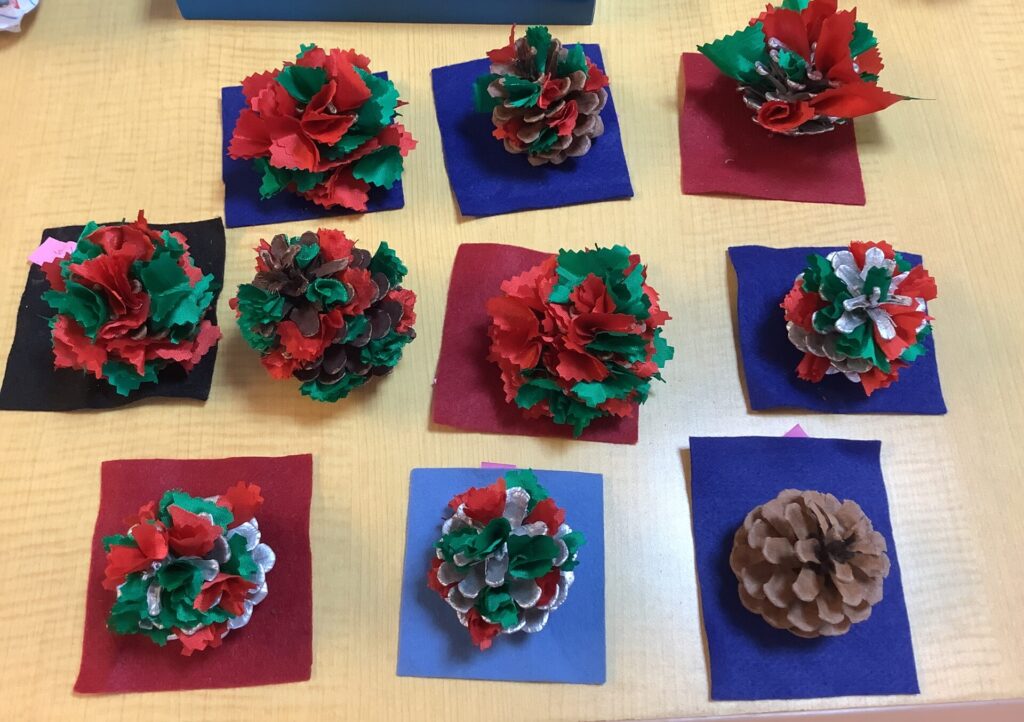 ひとり一人の個性を大切にして 松ぼっくりツリーが出来上がりました。 -