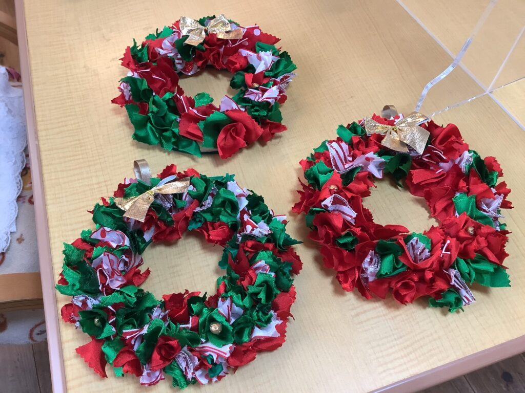クリスマスツリーとリース作り! 赤と緑のリボンを切って、発泡スチロールのリースにのり付け、 どんどんできていくと楽しいね。 -