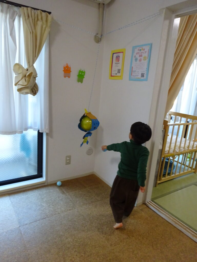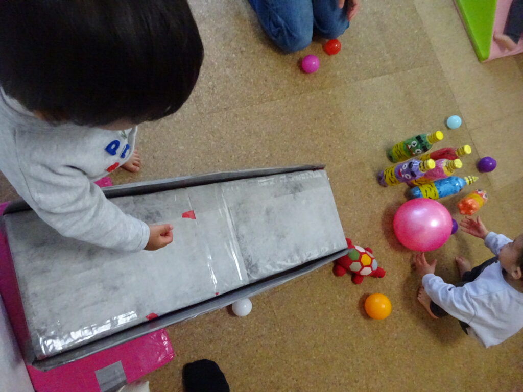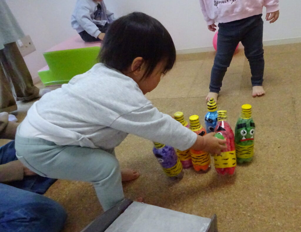 お子さんたちは、鬼のピンが倒れるのが楽しくて何度もボールをコロコロと転がして楽しんでいました。