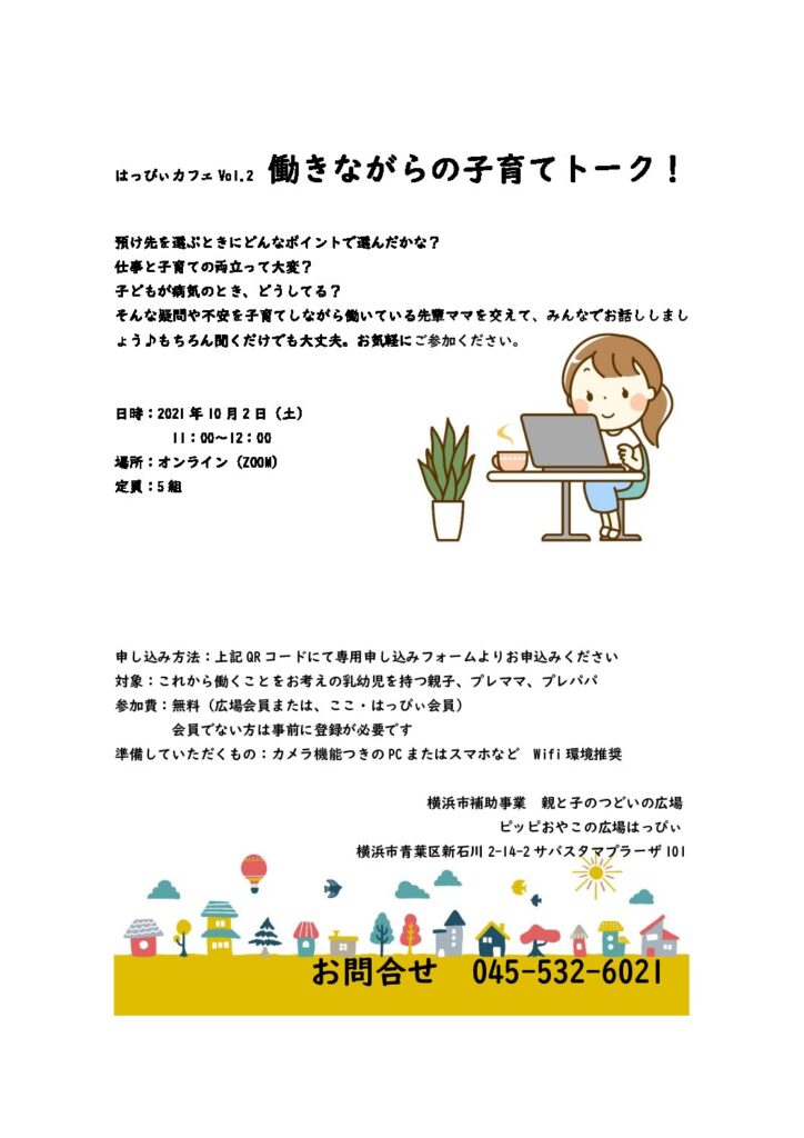 【告知】明日10/2㈯ 11:00~12:00 「はっぴぃカフェVol.2 働きながらの子育てトーク」を開催します!!