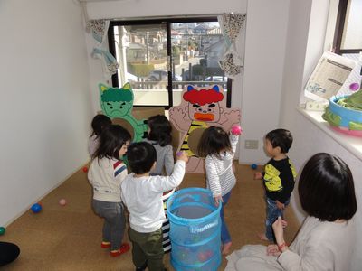 2/1は節分のイベントの日でした。 おにのパンツの絵本で士気を高めてから、さぁ鬼退治へしゅっぱーつ! 鬼めがけてボールを投げて♪おにはーそと!! 小さな子はお兄ちゃんお姉ちゃんの様子を見ながら。楽しい様子。 ちょっと大きなお兄ちゃんは、どうだと... -
